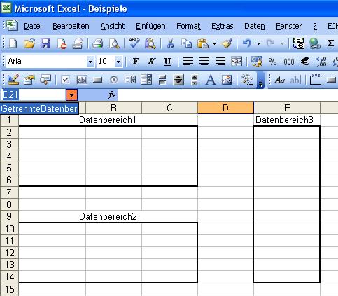 Wurde für getrennte Bereiche ein Name vergeben, so lassen sie sich sehr schnell über die Zelladresse oben links in der Ecke anspringen, da hier alle vergebenen Namen ( leider meines Wissens nach nur wenn sie nicht dynamisch sind ) angezeigt werden.