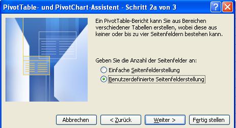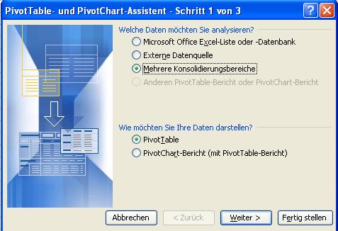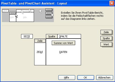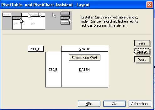 Zu diesem Zweck rufen wir über Menü - Daten - Pivottable und PivotChartBericht den Assistenten auf.