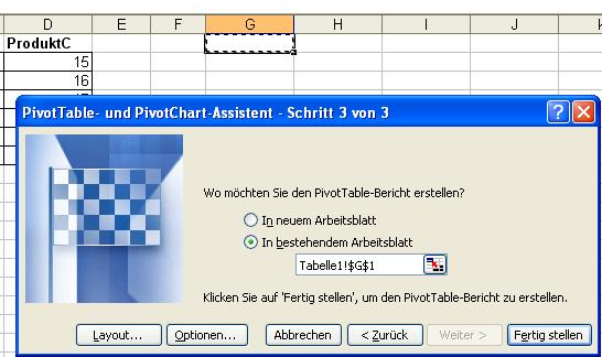Nach Klick auf Weiter wählen wir eine freie Zelle ausserhalb des Datenbereichs. Hier ist es G1.