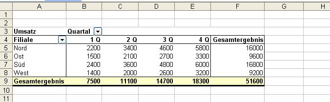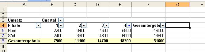 Zu diesem Zweck muss die Zelle aktiviert werden, welche sich rechts der letzten Spalte der Pivottabelle befindet und in der gleichen Höhe wie die Überschriftenzeile ist. In diesem Beispiel Zelle G4.