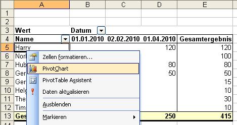 Excel erzeugt nun ein Diagramm auf Datenbasis der Pivottabelle. Desweiteren werden die Pivotbezeichnung des Zeilen- und Spaltenfeldes in Form eines Dropdownmenüs analog zur Pivottabelle angezeigt. In diesem Beispiel könnte nun ein bestimmtes Datum oder ein/mehrere Namen ausgeblendet werden.