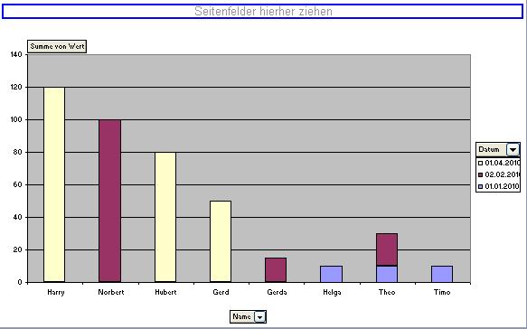 Nun kann es ja durchaus vorkommen, dass ein Diagramm andere Informationen graphisch darstellen soll, wie in diesem Beispiel ohne Datumsfeld. Hier hilft ein kleiner Trick. Es wird die komplette Pivottabelle markiert, kopiert und beispielsweise in einem leeren Tabellenblatt eingefügt. Diese Pivottabelle dient nun als Datenbasis für ein Diagramm. Änderungen am Diagramm wirken sich nun nicht mehr auf die originäre Pivottabelle aus. Das Tabellenblatt kann ausgeblendet werden. Wird nun die originäre Pivottabelle aktualisiert, so aktualisiert sich auch die Kopie. Somit können Pivottabelle und Diagramm einen unterschiedlichen Aufbau haben.