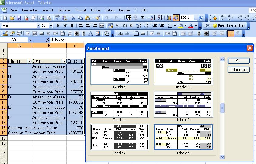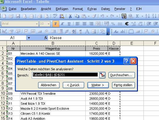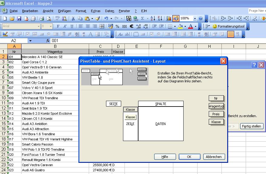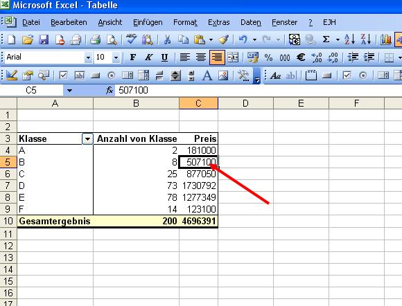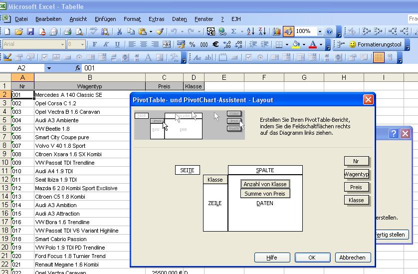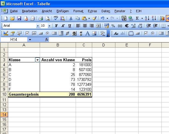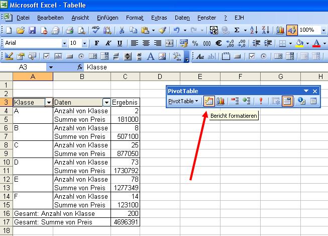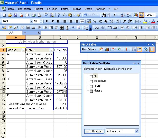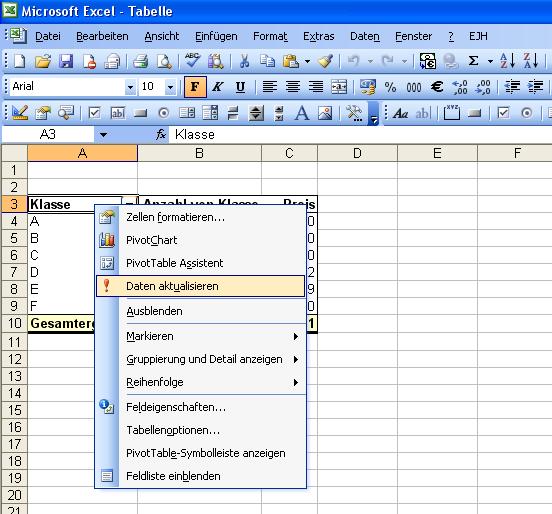 Das Feld “Klasse” im Datenbereich sollte jetzt “Anzahl von Klasse” heißen und Preis “Summe von Preis”. Ansonsten Doppelklick auf das Kästchen und entsprechende Option auswählen. ( Die Klicks zähle ich jetzt nicht :-)