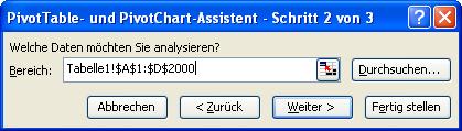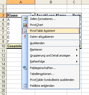 Der Bereich der Pivottabelle umfasst jetzt exakt den Bereich der Rohdaten. Wählt man jetzt nochmal den Assistenten ( Rechtsklick in den Datenbereich der Pivottabelle ).