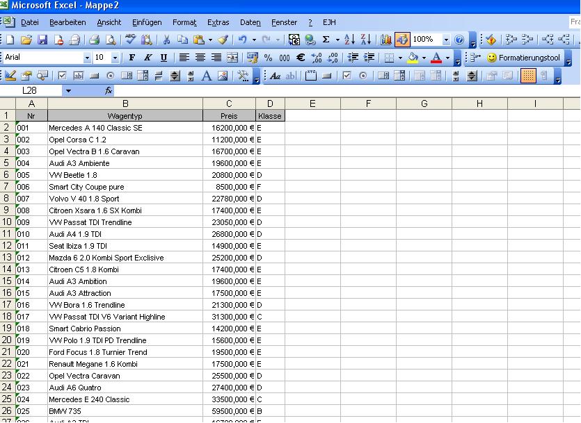Gegeben seien einige ( hier 200 Datensätze ) fiktive Rohdaten mit Überschriften. Ermittelt wird die Anzahl sowie der Gesamtwert der Klassen in Spalte D.