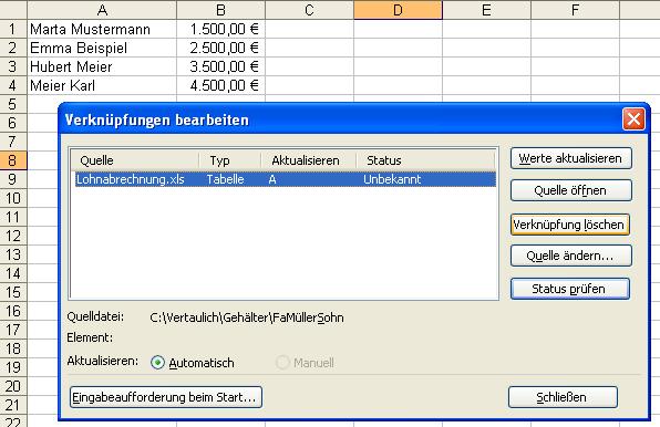 Bevor eine Mappe weitergereicht wird, sollte geprüft werden, ob es externe Verknüpfungen gibt. In den meisten Fällen kann der Empfänger die Werte nicht aktualisieren und erhält so fehlerhafte Angaben. Der Pfad der Datenherkunft ist aber ersichtlich, was ebenfalls nicht unbedingt erwünscht ist.
