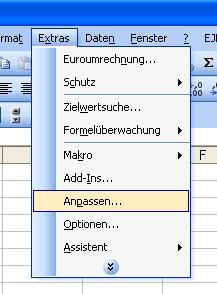 Über das Menü Extras - Anpassen, rufen wir das Fenster zur Bearbeitung der Symbolleisten auf.